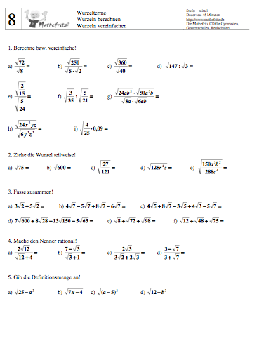 Wurzeln Aufgaben Klasse 8 / Klasse 9 (Klassenarbeit)